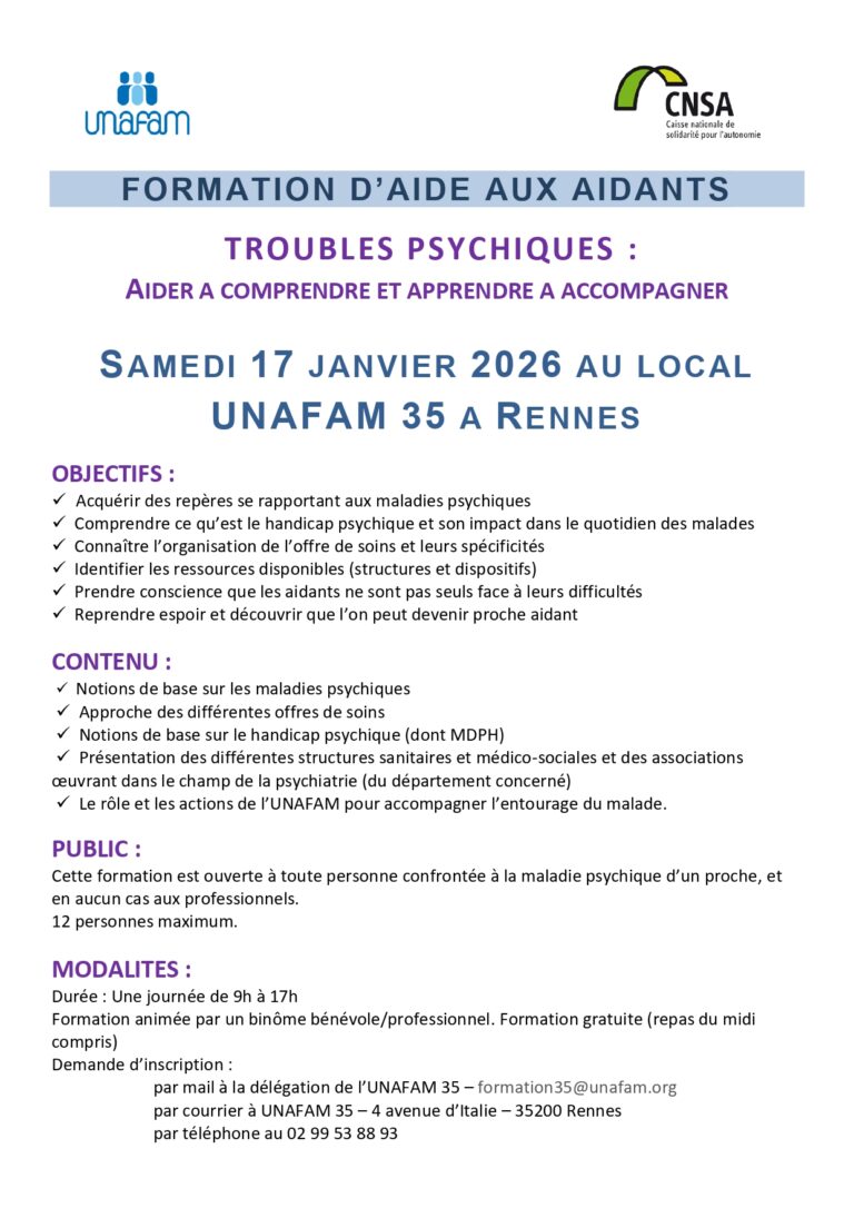 L'UNAFAM,union nationale de familles et amis de personnes malades et/ou handicapées psychiques, propose une formation à destination des aidants. TROUBLES PSYCHIQUES : Aider à comprendre et apprendre à accompagner