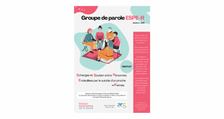 La Maison Associative de la Santé propose un groupe de parole pour les personnes endeuillées par le suicide d’un proche, animé par Claire Stindel, psychologue et Sylvie Galardon, bénévole. Un espace d’échanges et de soutien, dans un cadre confidentiel et bienveillant.
